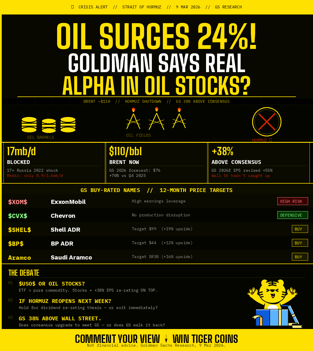 $WTI Crude Oil - main 2604(CLmain)$ posted its biggest single-session move in years. $Brent Last Day Financial - main 2605(BZmain)$ is now near $110/bbl — up over 70% vs Q4 2025 average. Most retail traders rushed into oil ETFs. Goldman Sachs quietly dropped a note this morning suggesting that's the wrong trade.