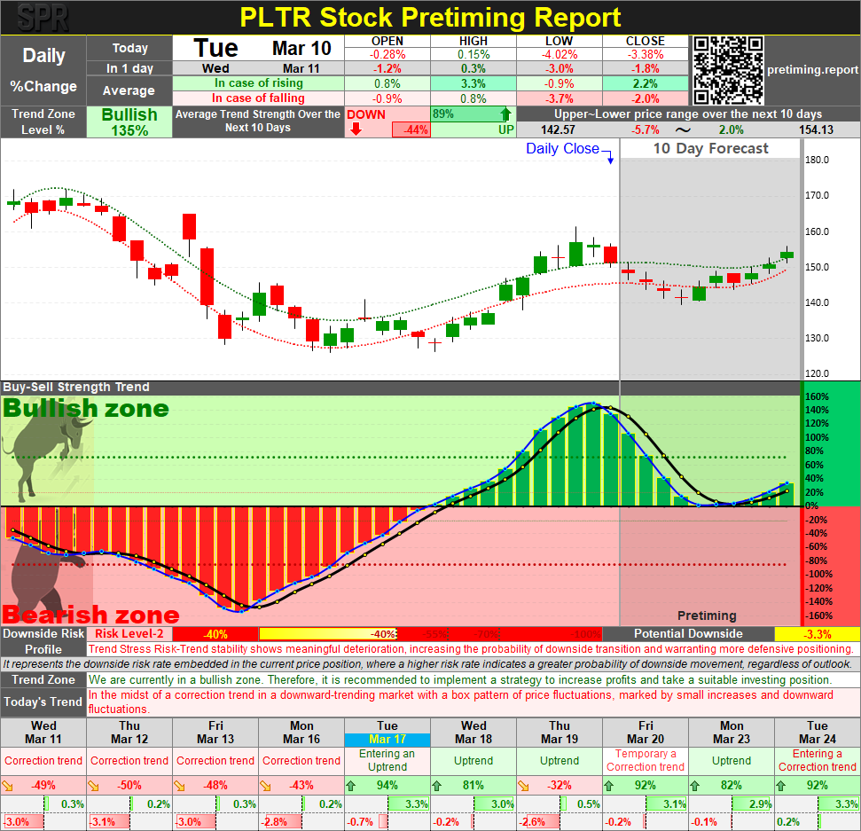 ➡️ Analyst Insight: PLTR's long-term structural profile remains among the most constructive available within the Bullish zone framework. The 0% Bearish zone probability eliminates near-term zone transition risk entirely, and the +15.7% cumulative gain provides a substantial buffer against the ongoing correction. The Trend Zone & Level% normalization — from the current Bullish 135% toward the expected 10-day average of Bullish 32% — is the structural mechanism driving the correction, and it is expected to resolve within the Bullish zone. Long-term investors holding since February 23 are advised to maintain their position while tactically selling green candle strength during the correction and preparing to re-enter near $140.60 (March 16–17) to potentially improve cost basis efficiency ahead of the anticipated recovery. The extraordinary prior-period context — 30-day average of Bearish −27% transitioning to current Bullish 135% — confirms that PLTR has undergone a fundamental structural re-rating, and the correction is a healthy normalization within that newly established framework.