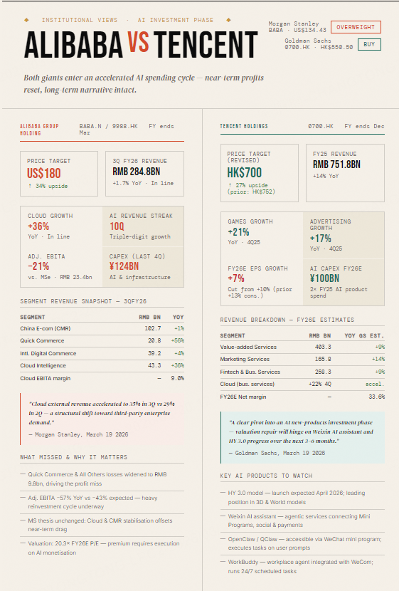 • Both companies are ramping AI capex — near-term profit pressure is a shared consensus view; Goldman expects Tencent's earnings growth to remain subdued through FY26–27