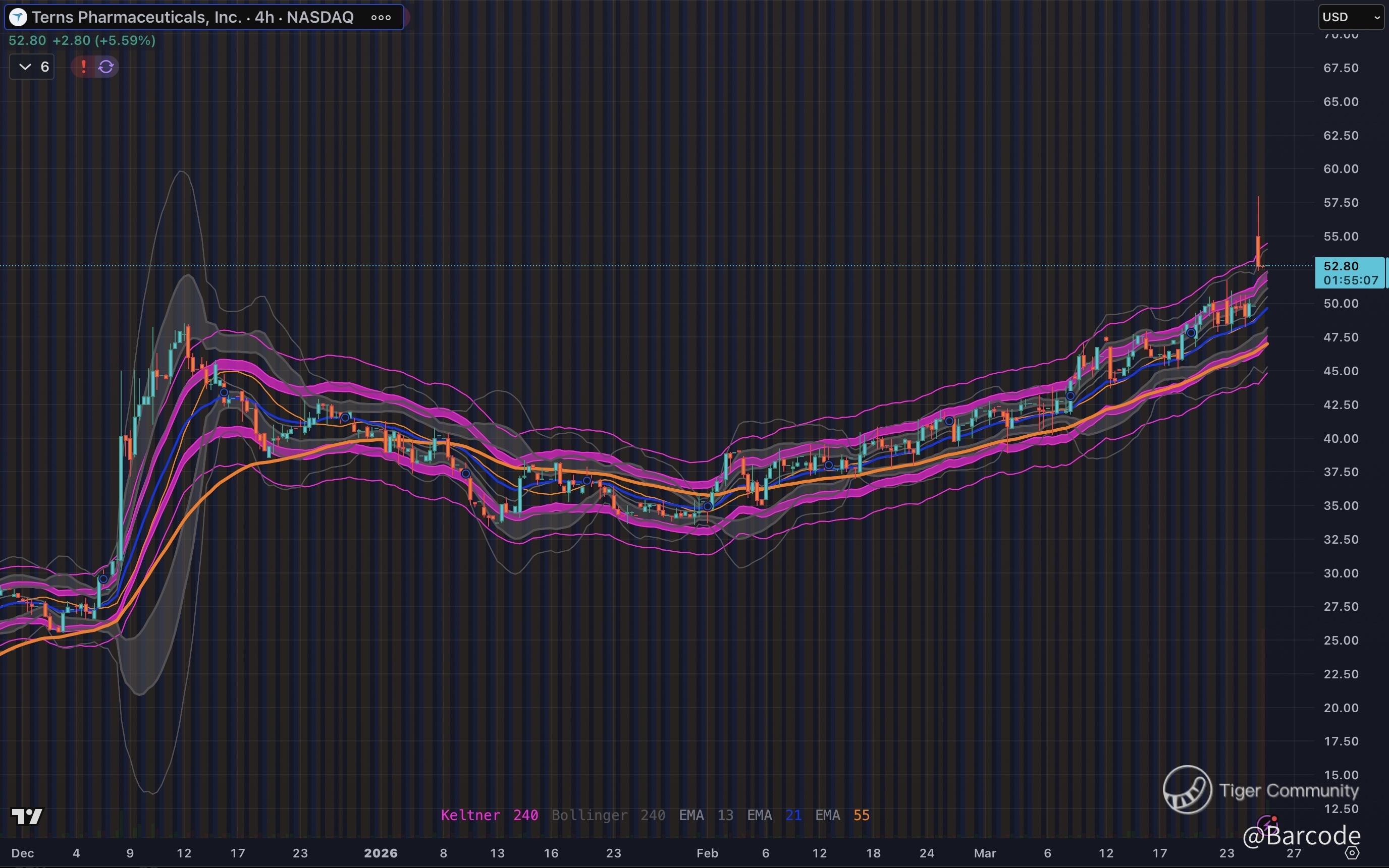 Technically, the chart structure is clean and trending with intent. Price has been riding the upper Keltner Channel while consistently holding above the 13 EMA and 21 EMA, both of which are now sloping upward in confirmation. The 55 EMA is acting as a dynamic trend floor, currently sitting well below price, reinforcing the strength of the move.