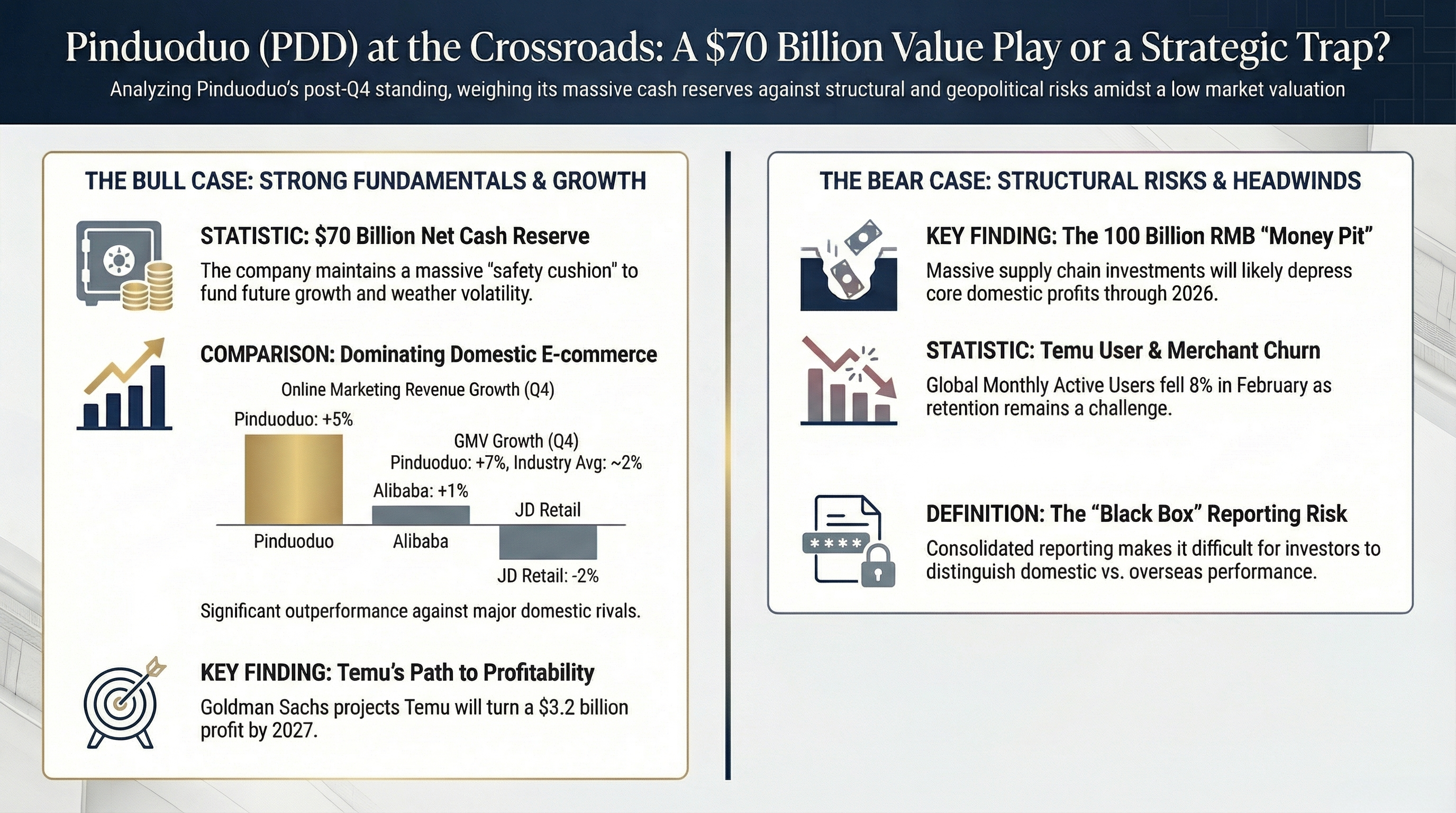 On paper, PDD is holding a royal flush. The domestic fundamentals have stabilized, its overseas arm Temu has stopped burning cash blindly, and the craziest part: the company is sitting on a mountain of $70 billion in net cash.