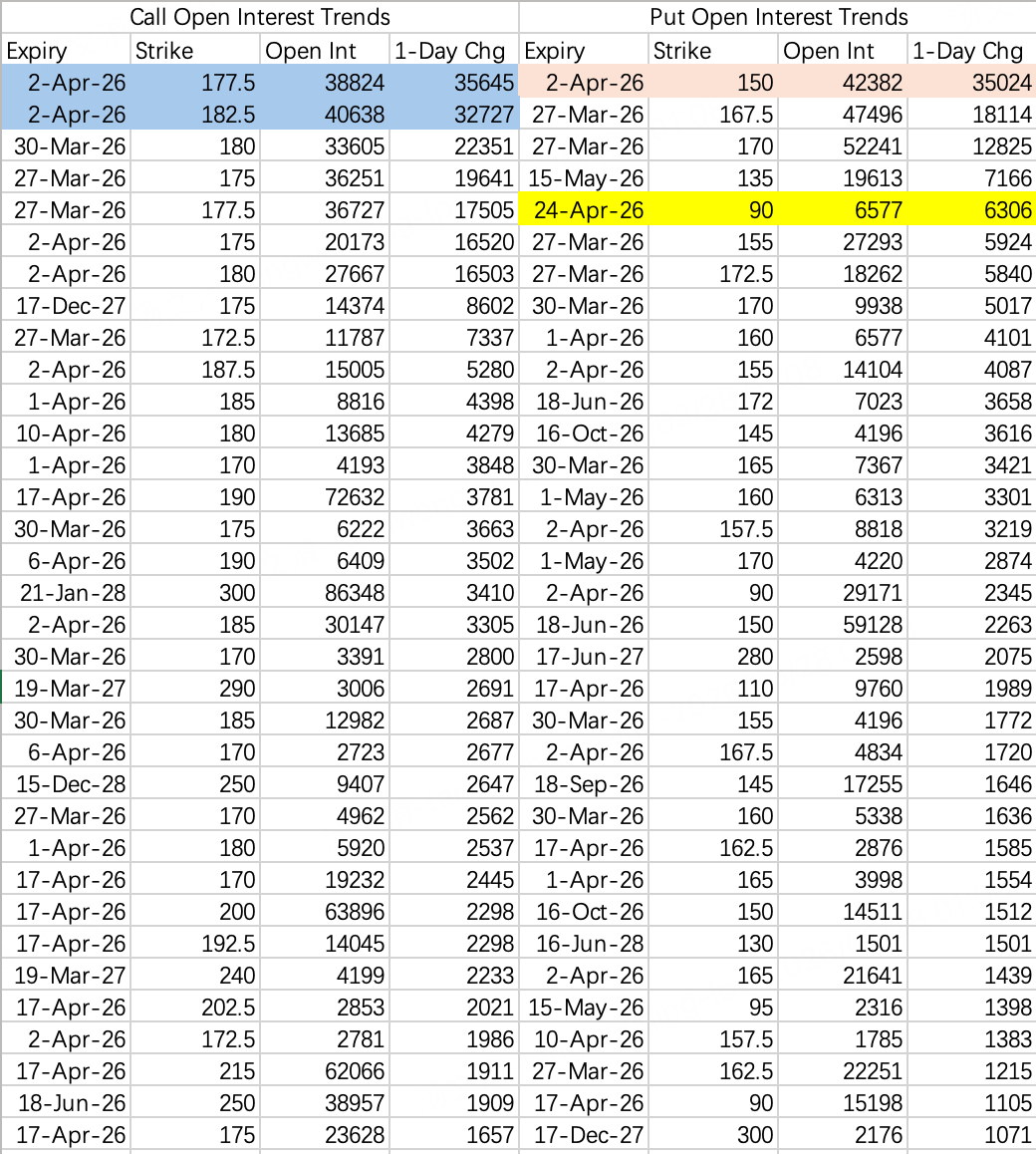 Next week's institutional spread: sell 177.5 call $NVDA 20260402 177.5 CALL$ , buy 182.5 call $NVDA 20260402 182.5 CALL$ . Expectation is a range of 160–175 next week.