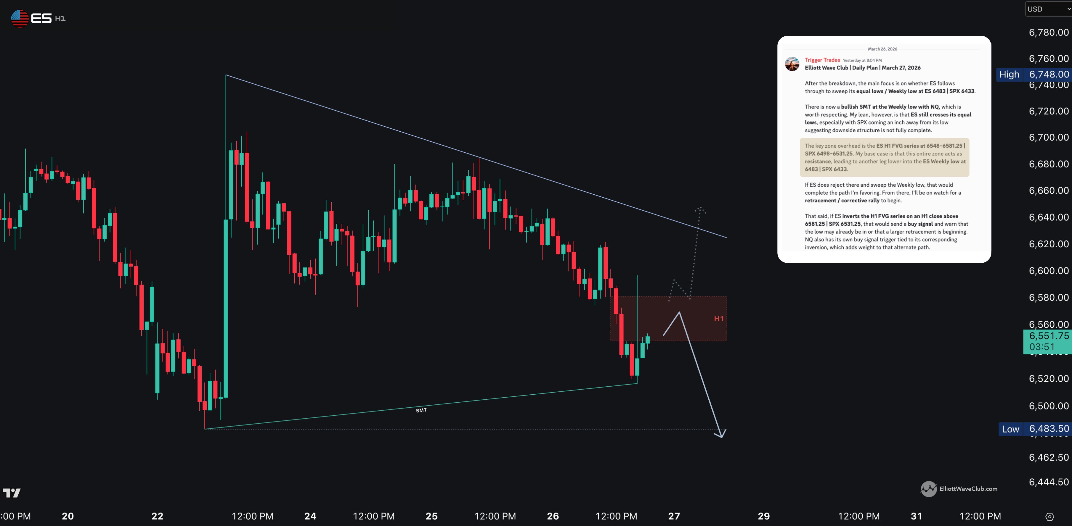 Last night's plan called for the $E-mini S&P 500 - main 2606(ESmain)$ H1 FVG to act as resistance → decline to ES 6483.