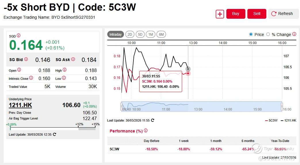 BYD shares initially fell as much as 5% at the open on Monday (30 March), lifting the BYD 5x Short DLC up +25% while the BYD 5x Long DLC fell by a similar magnitude.