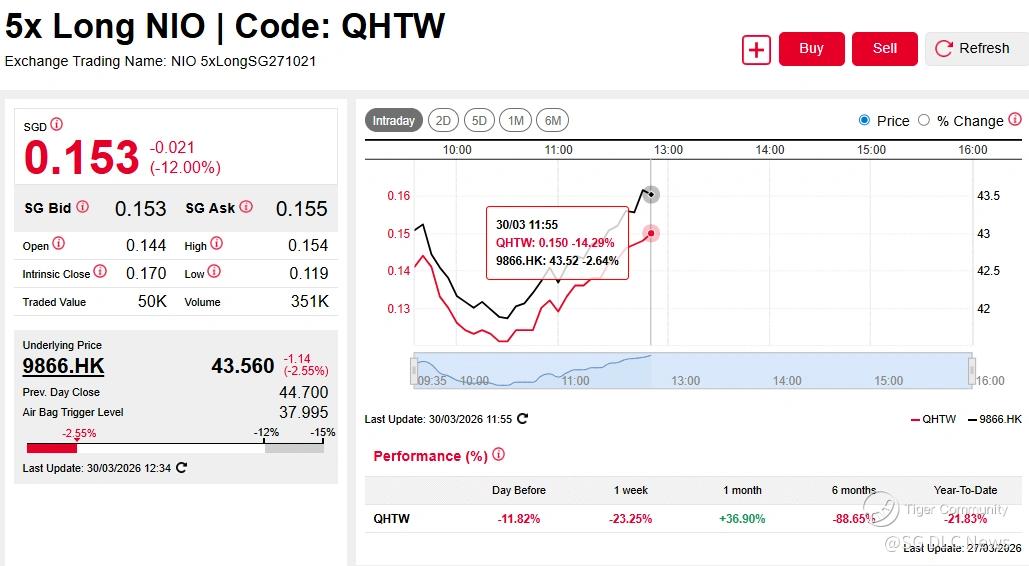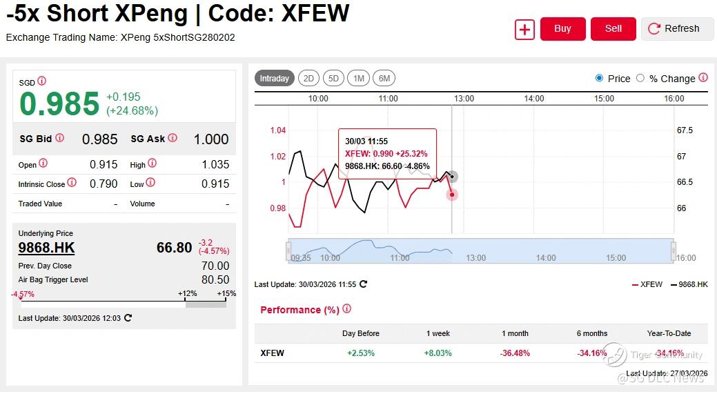Other EV counters traded lower in the morning session, with $NIO-SW(09866)$ down over 2.5% and $XPENG-W(09868)$ down 4.6%. Amplifying the return, the NIO 5x Long DLC fell 13%, while the XPeng 5x Short DLC rose 23%, with the XPeng 5x Long DLC declining a similar magnitude.