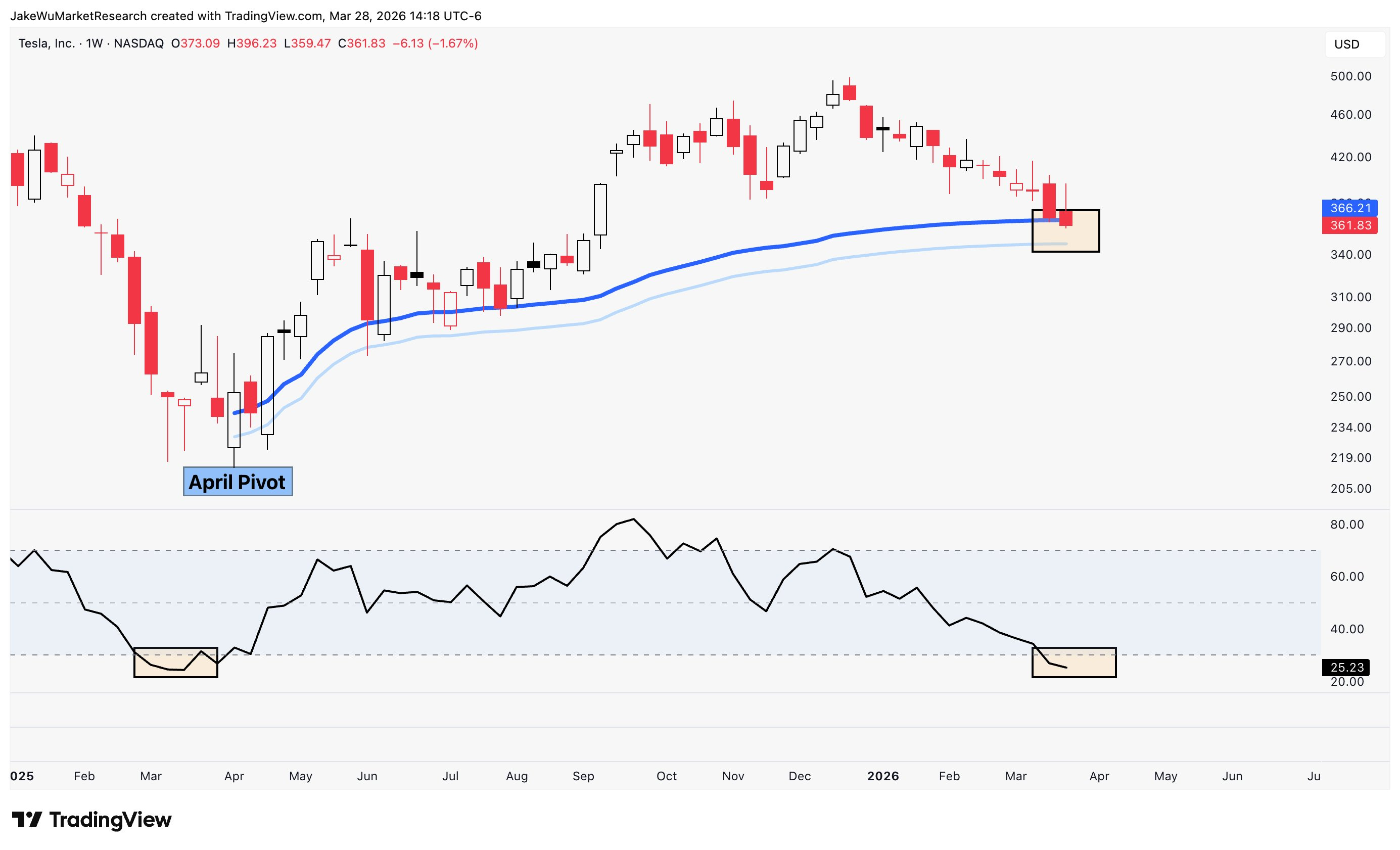 $Tesla Motors(TSLA)$Entering oversold territory on the weekly candle chart as price tests the April pivot VWAP zone.