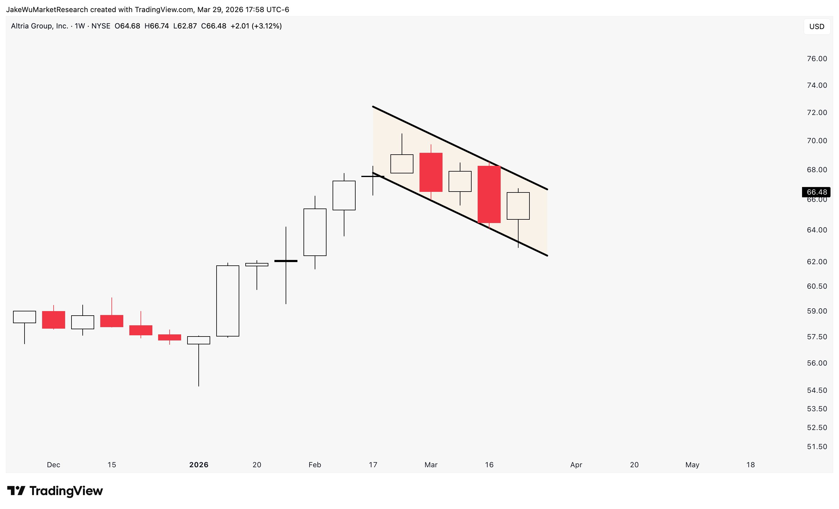 $Altria(MO)$Bull flag setup on the weekly candle chart.