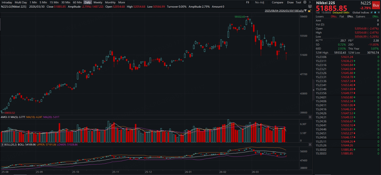 On March 30, Japanese equities weakened significantly. The Nikkei 225 Index closed down 2.79%, with deeper losses seen intraday, while the Topix Index also declined by around 2.9%.