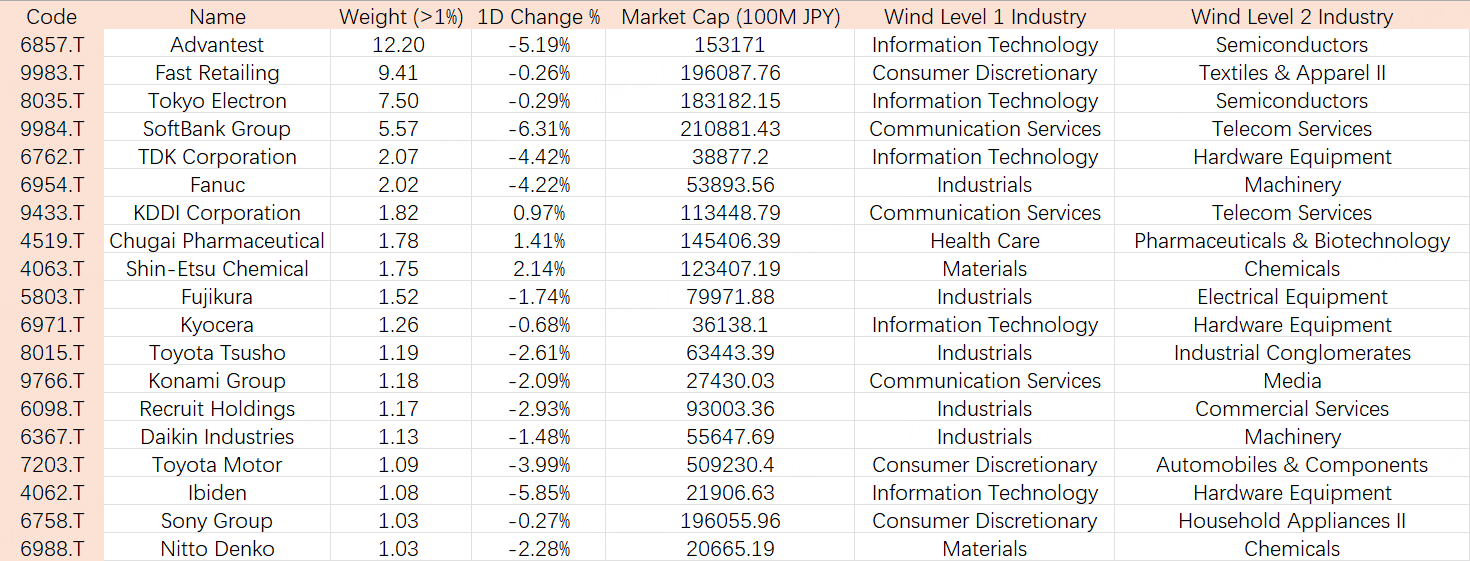 Meanwhile, Fast Retailing, with a weight close to 10%, and Tokyo Electron, above 7%, saw relatively smaller declines. At the same time, there were clear signs of capital reallocation. Chugai Pharmaceutical rose 1.41% and Shin-Etsu Chemical gained 2.14%, indicating that some funds were rotating out of high-volatility technology stocks into more defensive, stable cash-flow businesses.
