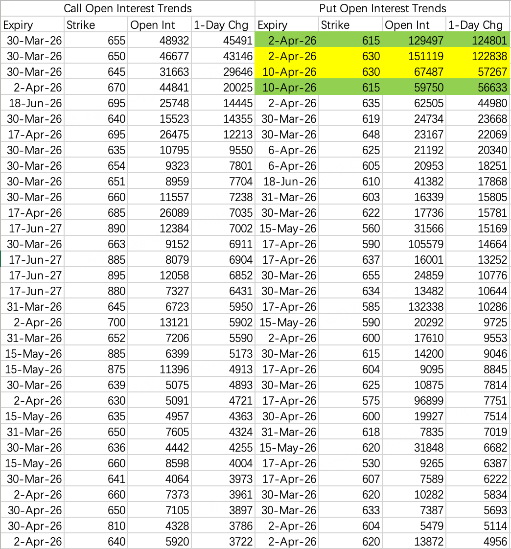 Bears are blunt on SPY: two put spreads. One on this week's expiry targeting 630–615. Another on next week, same range. $SPY 20260402 630.0 PUT$ / $SPY 20260402 615.0 PUT$ .