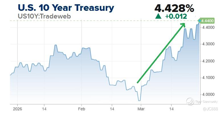 Investors are entering the week with a "risk-off" posture as US 10-year Treasury yield’s surge to 4.428% (see above) from 2.97% (on 27 Feb 2026), a month ago.