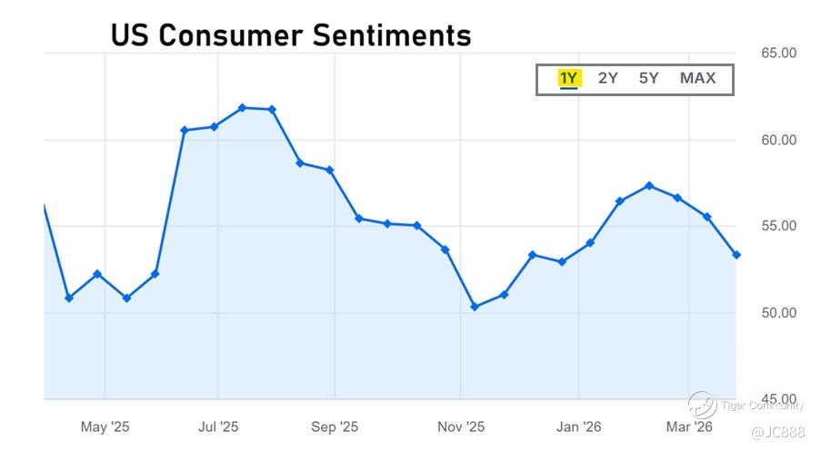 For March 2026, the US Consumer Sentiment Index report dropped to a final reading of 53.3, the lowestnumber since December 2025 and lower than its March’s preliminary reading of 55.5.
