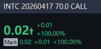 There are 504.08K $Intel(INTC)$ option contracts traded on Monday, up 32% from the previous trading day. Call options account for 65% of overall option trades. Particularly high volume was seen for the $70 strike call option expiring Apr 17, 2026, with 31,514 contracts trading. $INTC 20260417 70.0 CALL$