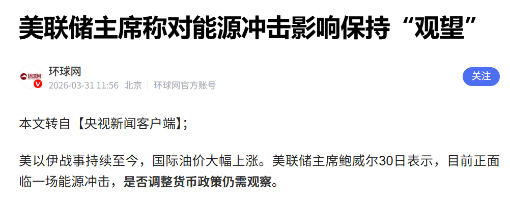 Furthermore, Federal Reserve Chair Jerome Powell’s latest remarks have slightly moderated market expectations for future rate hikes. According to a recent report citing CCTV News, Powell stated that the US is currently facing an energy shock driven by the ongoing US-Israel-Iran conflict and soaring international oil prices, adding that the Fed will remain in a "wait-and-see" mode before adjusting monetary policy.