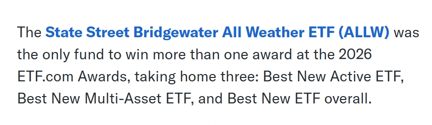 Recently, the $SPDR BRIDGEWATER ALL WEATHER ETF(ALLW)$ has performed exceptionally well, becoming the only fund to win multiple awards at the 2026 ETF.com Awards, thus making headlines.