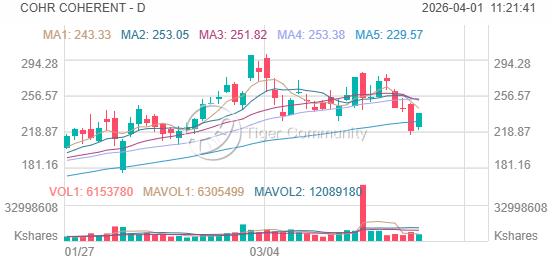 COHR closed at $238.21 on 2026-03-31, surging +8.45% ($18.56). The stock is now ~20.7% below its 52-week high of $300.20.