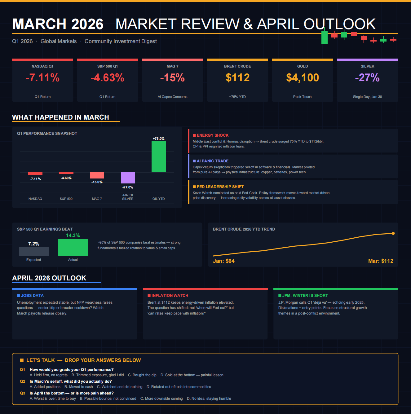 March felt like a regime shift — when the $NASDAQ(.IXIC)$ , $S&P 500(.SPX)$ , and even Gold all sold off together, it showed liquidity was driving markets more than fundamentals. Oil and inflation fears quickly flipped expectations back to “higher for longer.” My Q1 performance was decent, but mainly driven by risk control. It was a reminder that diversification doesn’t always protect you in these environments.