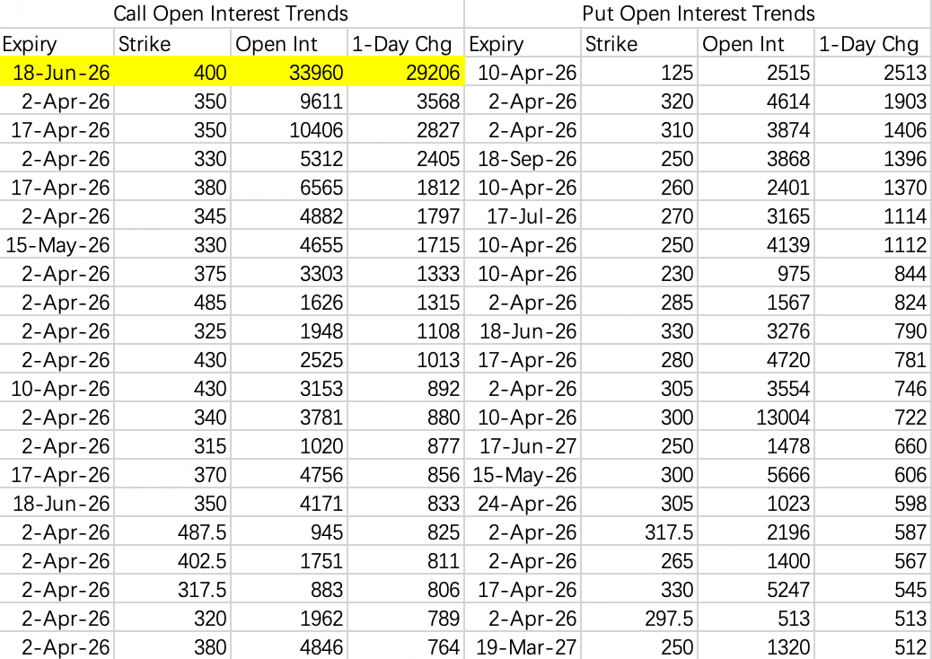 Then, looking at open interest, a new position emerged: 29,000 contracts of the June 18th 400 call $MU 20260618 400.0 CALL$ were bought.