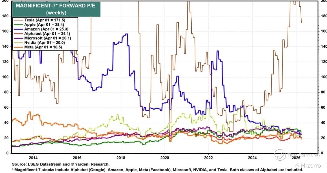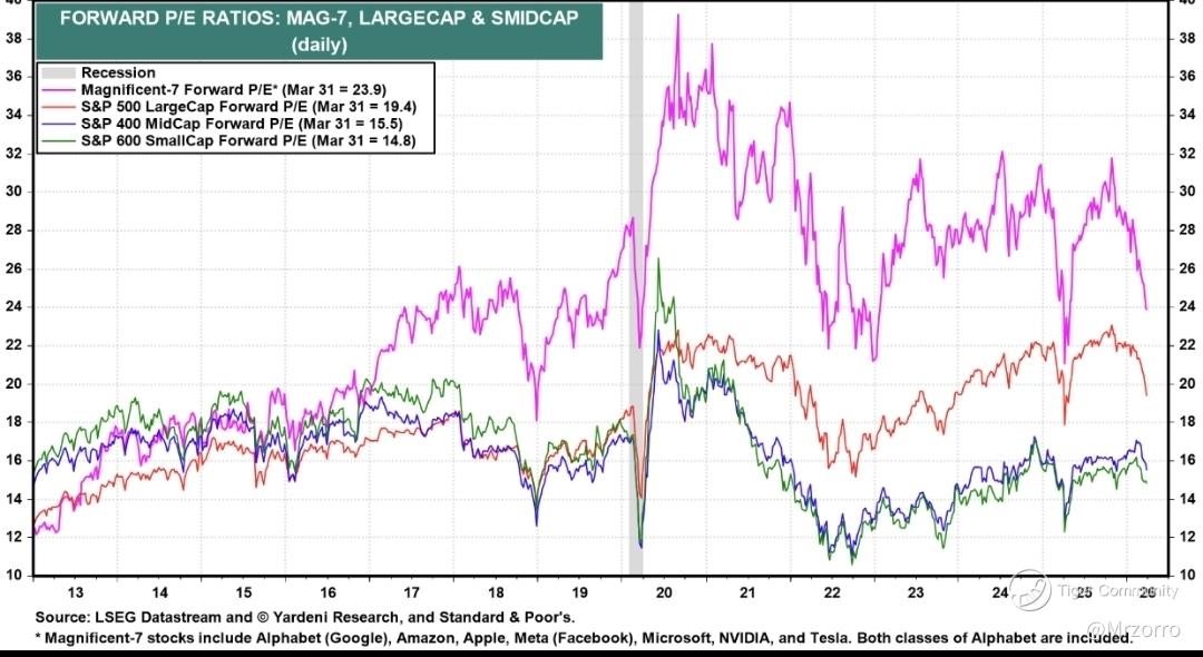The Magnificent Seven have seen a similar reset, with the group's forward P/E falling to 23.9x — and several names now trading at notably modest multiples: $Meta Platforms (META.US)$ at 18.5x, $NVIDIA (NVDA.US)$ at 20.0x, $Microsoft (MSFT.US)$ at 20.1x, and $Alphabet-C (GOOG.US)$ at 24.1x.