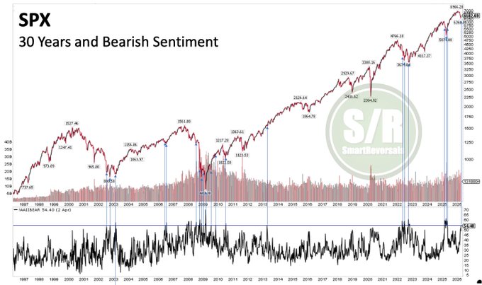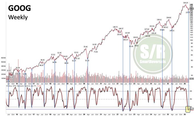 Rare levels of bearish sentiment in $SPX historically lead to relief rallies and often precede major bottoms, while $GOOG shows a bullish stochastic crossover in oversold territory—typically a strong setup for a rebound.