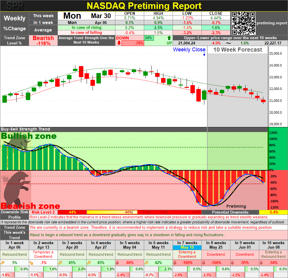 The sudden shift from strong selling flow to strengthening buying flow has introduced significant instability in the weekly trend model. With the near-term turning point arriving this week, the coming week (April 6) is the first critical observation window — a weekly close below this week's 21,879.2 would confirm the downside arc toward 21,524.6 is developing on schedule. The 0% Bullish zone probability within 10 weeks means the Rebound Trend is operating without structural recovery support, making the forecast more sensitive to unexpected macro developments. Treat all near-term targets as directional reference points and monitor weekly updates closely through the Apr 13–20 buy window.