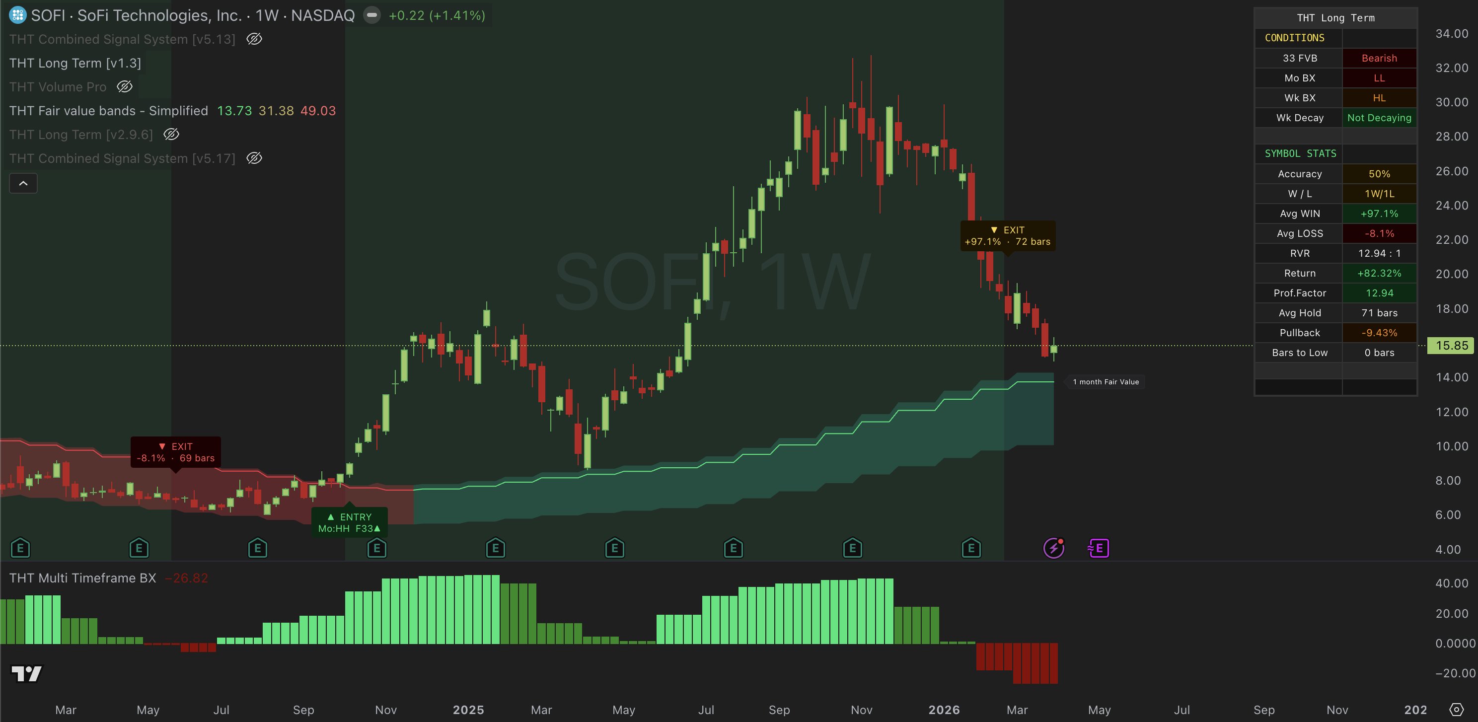 The fair value band is the second piece. On the monthly timeframe this tends to act as strong institutional support and a clean place to start a long term position. We are not there yet.