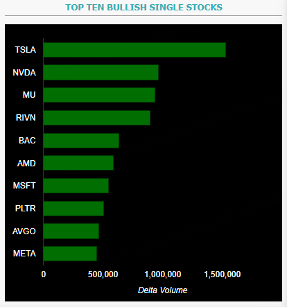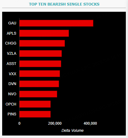 This report shows stocks with the highest volume of bullish and bearish activity by option delta volume, which converts option volume to an equivalent stock volume (bought or sold).