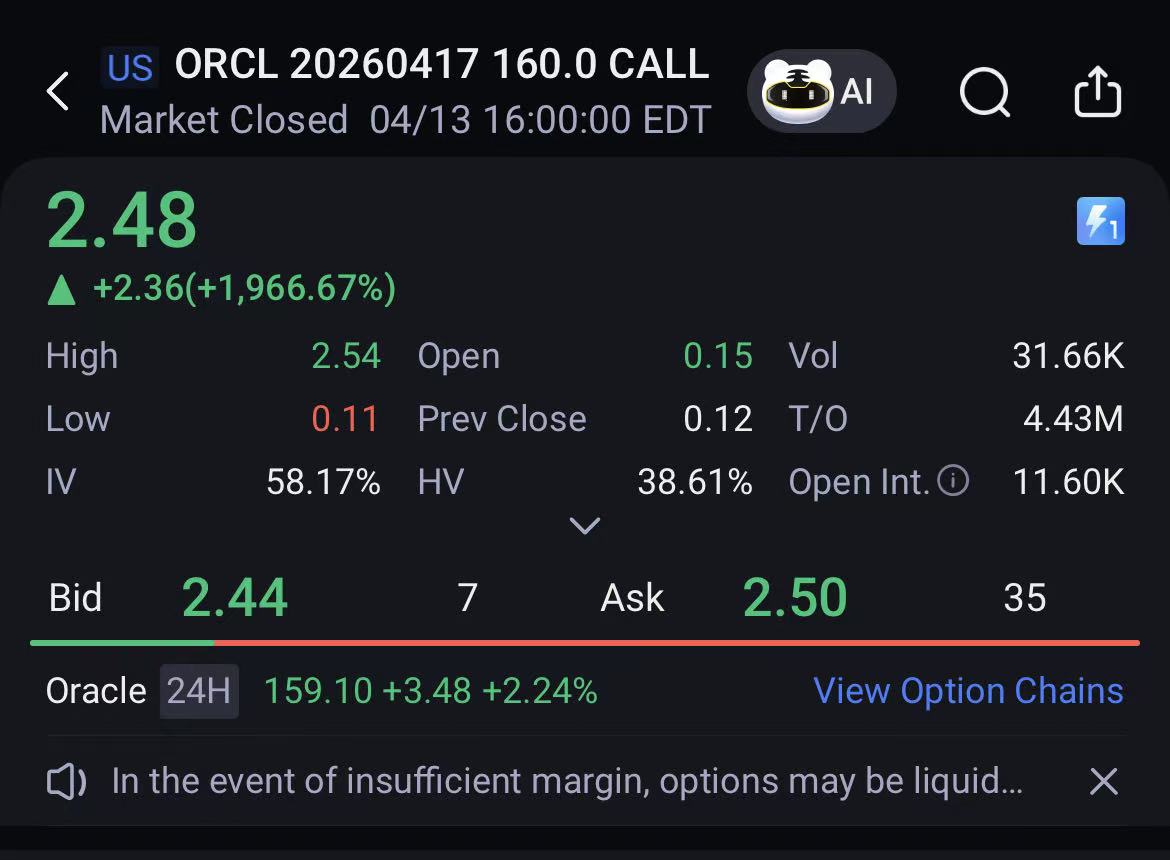 A total number of 611.96K options related to $Oracle(ORCL)$ were traded on Monday, of which call options accounted for 74%. Particularly high volume was seen for the $160 strike call option expiring Apr 17, with 31,663 contracts trading. $ORCL 20260417 160.0 CALL$