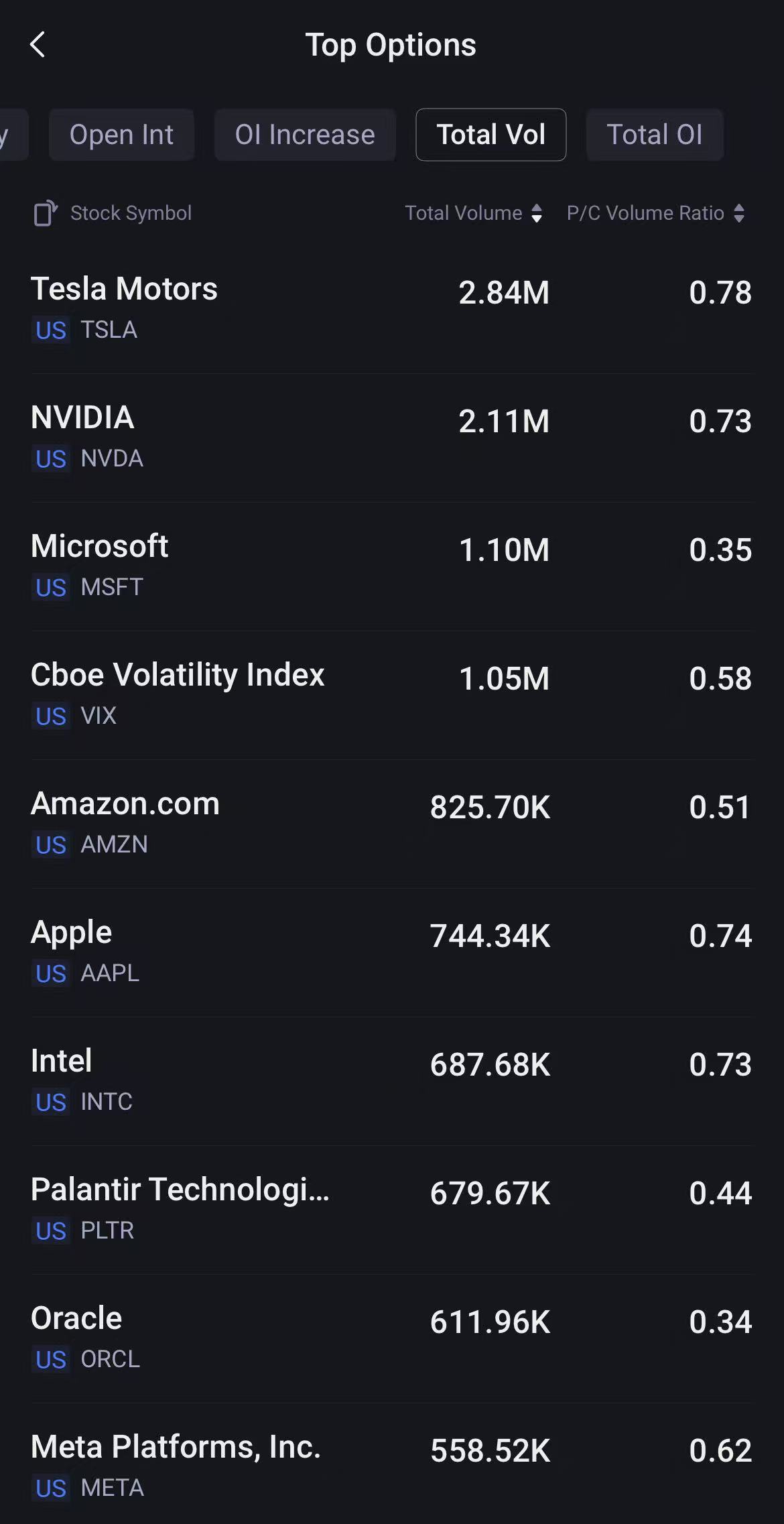 Top 10: $Tesla Motors(TSLA)$, $NVIDIA(NVDA)$, $Microsoft(MSFT)$, $Cboe Volatility Index(VIX)$, $Amazon.com(AMZN)$, $Apple(AAPL)$, $Intel(INTC)$, $Palantir Technologies Inc.(PLTR)$, $Oracle(ORCL)$, $Meta Platforms, Inc.(META)$
