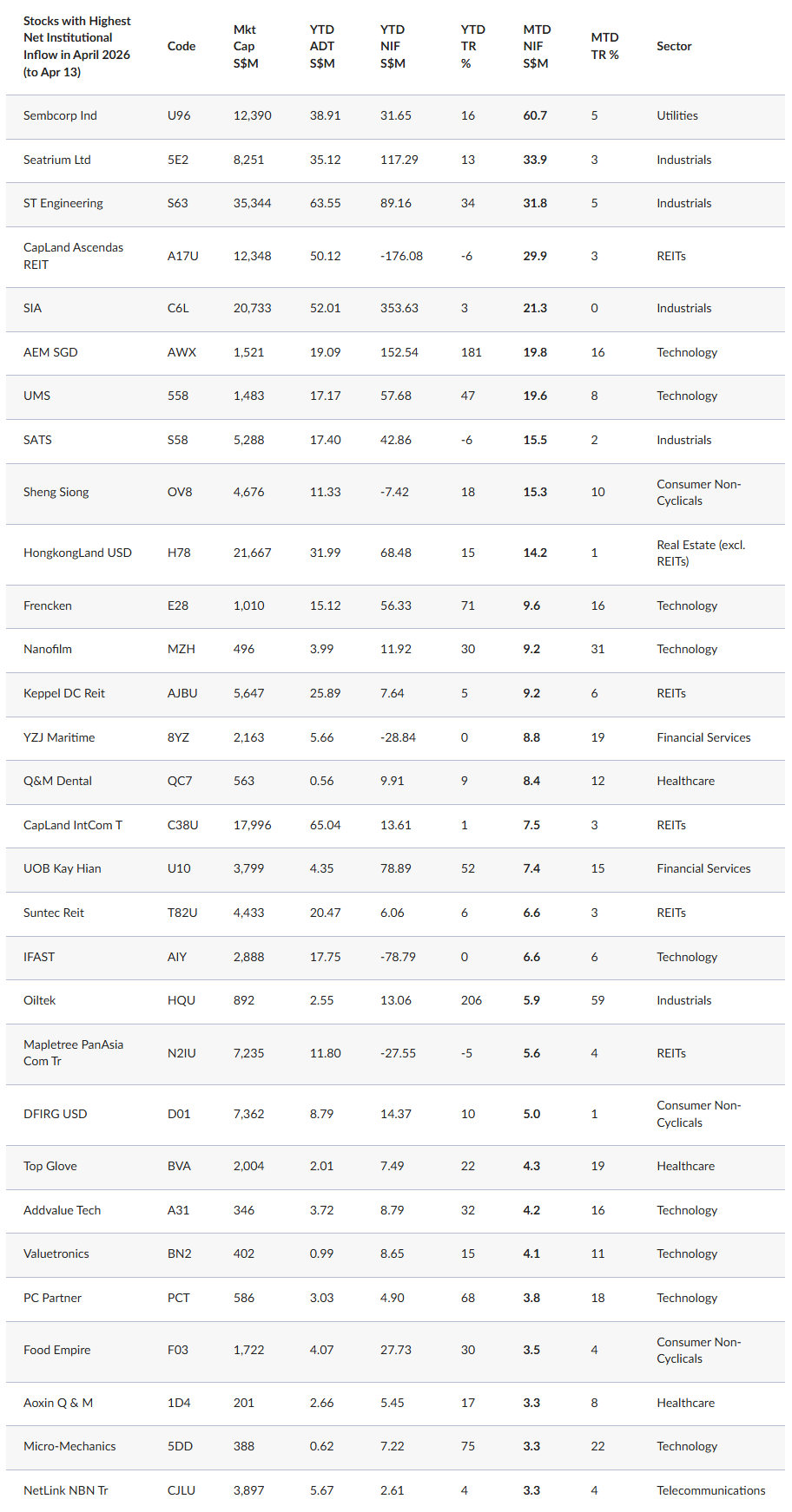 Net institutional inflow in April has been the strongest in Industrials, Technology and Utilities. Within Technology, inflows have included businesses such as $AEM SGD(AWX.SI)$ , $UMS(558.SI)$ and $Frencken(E28.SI)$ , which operate within semiconductor manufacturing and test ecosystems.