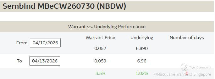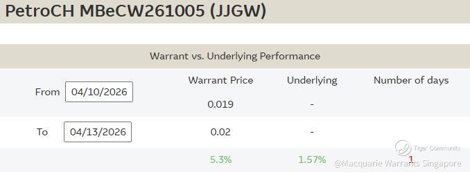 ✳Yesterday when crude oil prices surged more than 8% to trade back above USD100 a barrel, crude oil names such as PetroChina (+1.6%, HKD 10.97) and utilities names such as Sembcorp Industries (+1%, $6.95) finished higher for the day, while trending warrants PetroChina call $PetroCH MBeCW261005(JJGW.SI)$ (https://warrants.com.sg/tools/HistoricalPerformance/JJGW) was up 5.3% to SGD 0.020 and Sembcorp Industries (SCI) call $SembInd MBeCW260730(NBDW.SI)$ (https://warrants.com.sg/tools/HistoricalPerformance/NBDW) added 3.5% to SGD 0.059