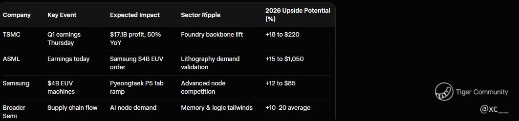 The semiconductor world is on fire this week with $Taiwan Semiconductor Manufacturing(TSM)$ and $ASML Holding NV(ASML)$ both reporting in what traders are calling “Semi Super Week,” and the stakes couldn’t be higher. TSMC is expected to smash records on Thursday with Q1 revenue topping TWD 1.13 trillion (roughly $35.6 billion) for the first time ever and net profit surging 50% year-over-year to TWD 542.6 billion (about $17.1 billion) — marking its ninth straight quarter of profit growth on the back of explosive AI demand. Meanwhile, ASML reports earlier today, and the latest supply-chain intel shows Samsung Electronics dropping a massive $4 billion order for around 20 EUV lithography machines for its Pyeongtaek P5 fab. This order is a huge vote of confidence in advanced node production, but it also highlights anxiety around order visibility and execution risks in a world where AI chip demand is insatiable yet supply chains remain fragile. Emerging markets are watching closely, with Asia’s chip hubs pulling fresh inflows on 5G expansions and Latin America’s data center boom adding 8% compute demand spikes amid global uncertainty. Tariff escalations crimp 5%, but QT’s $1T flood keeps upside alive for resilient holds. Let’s break down TSMC’s profit goal, ASML’s order jitters, the Samsung catalyst, and spot if this Super Week cements the AI chip supercycle or exposes cracks in the supply chain for 2026. 📉⚡