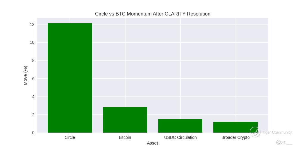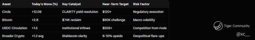 Bitcoin's reclaim of $74,000 has set the stage for a March high breakout, but the CLARITY resolution could provide the regulatory tailwind needed to sustain momentum toward $80K. Stablecoins like USDC act as the bridge between fiat and crypto, and clearer rules reduce friction for institutions, potentially unlocking fresh inflows that lift BTC's floor. If Circle's momentum continues, it could become the new focal point in crypto infrastructure, drawing capital that indirectly supports Bitcoin's price discovery. However, BTC's high-beta nature means any fresh geopolitical flare-up or macro shock could still trigger a 5-8% pullback before $80K comes into play.