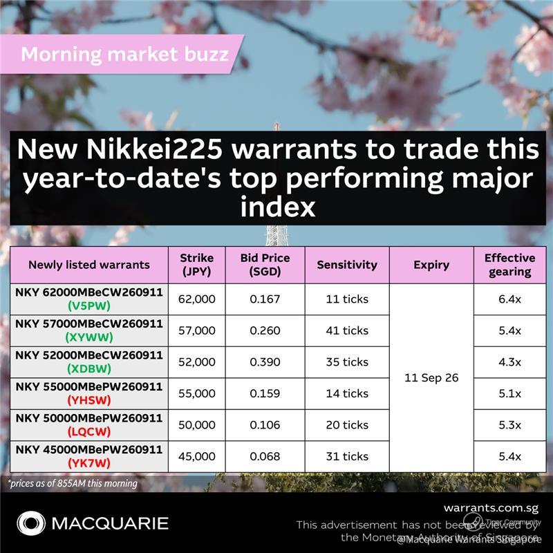 🆕Macquarie's newly listed Nikkei225 call and put warrants expiring in September offer investors a leveraged opportunity to trade the moves of the Nikkei225 at a low capital outlay with no risk of margin calls