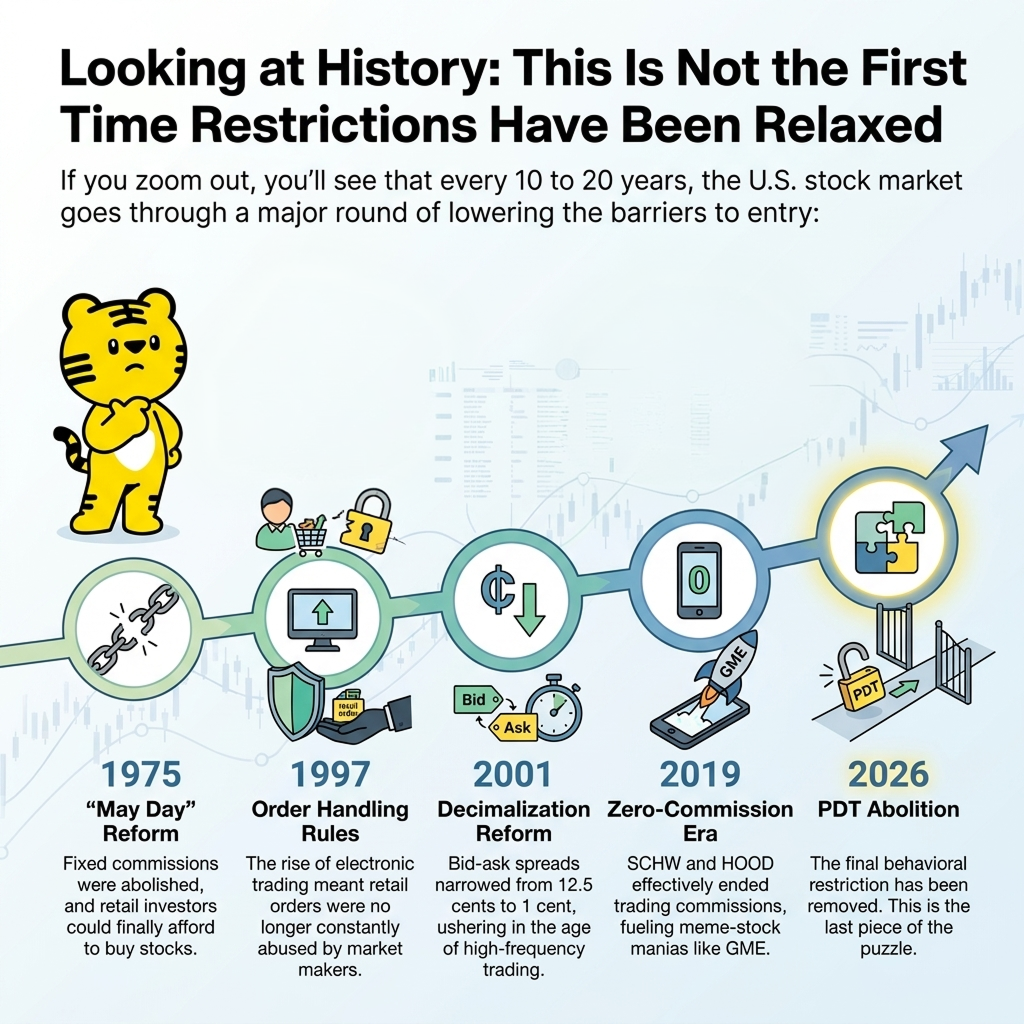 Looking back at past changes—from commission deregulation to the zero-commission wave led by $Robinhood(HOOD)$ and $Charles Schwab(SCHW)$ —each reform boosted access but also speculation. I see PDT removal the same way: higher volumes and tighter spreads, but the biggest winners are still brokerages and market makers, not the average trader.