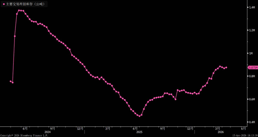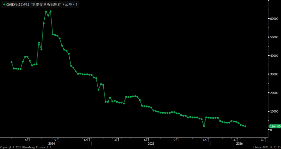 As of April 10, 2026, total aluminum inventories across the three major exchanges stood at about 0.875M, or 875,000 metric tons. Of this, COMEX aluminum inventories were approximately 1,864 tons, LME aluminum inventories were about 0.399M, and Shanghai aluminum inventories were around 0.474M.