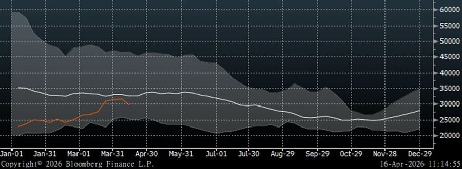 Cushing crude inventories: in Cushing, the main delivery hub for U.S. crude, the 2026 inventory curve (orange line) has also trended upward. But unlike national inventories, the latest absolute level in Cushing has fallen below 30,000, clearly below the 2021–2025 historical average (white line) and sitting at the lower end of its five-year historical range.