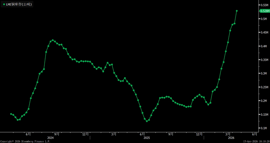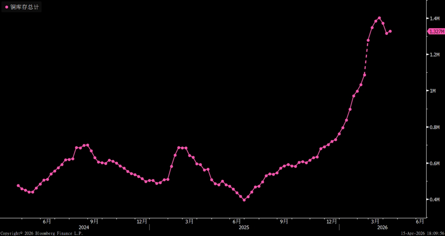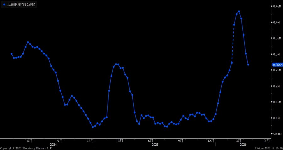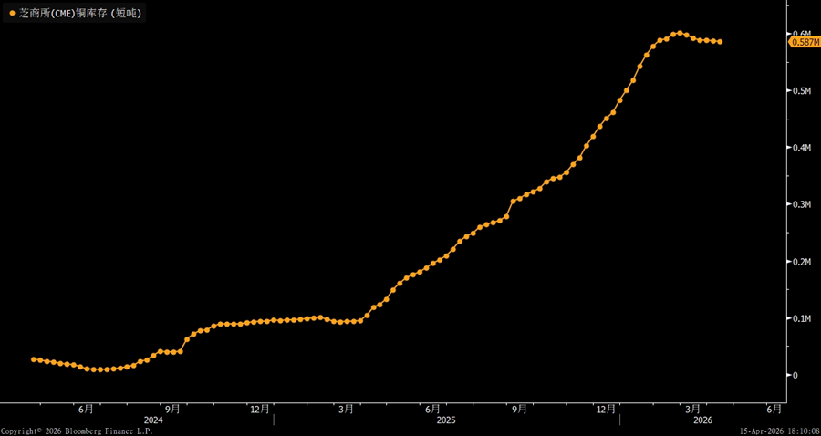 In terms of absolute levels and historical percentile, as of April 10, 2026, total visible global copper inventories stood at around 1.327M, or roughly 1.327 million metric tons, still at a relatively elevated level by recent historical standards. Of this total, CME copper inventories were about 0.587M short tons, LME copper inventories were around 0.393M, and Shanghai copper inventories were roughly 0.266M. Looking over a longer horizon, global copper inventories have largely stayed in a high range over the past year. In particular, overseas inventories had been rising steadily earlier on, leaving total inventories under sustained pressure and suggesting that the burden from high absolute stock levels has not yet been meaningfully resolved.