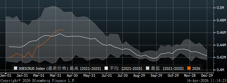 U.S. commercial crude inventories: as of April 15, 2026, the latest data point on the chart shows that the 2026 U.S. commercial crude inventory curve (orange line) has shown a stepwise rise. In historical percentile terms, although total inventories have increased recently, the current absolute level, at around 0.46M, is still not far from the 2021–2025 historical average (white line) and remains within the normal range of fluctuations seen over the past five years.