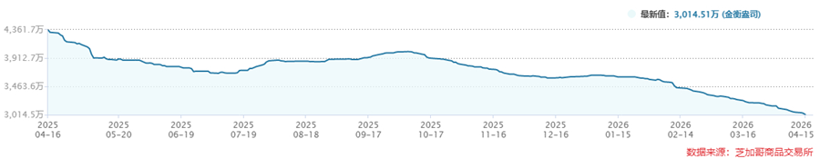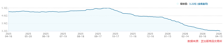 On the inventory side, which reflects the physical fundamentals, the latest data as of April 15, 2026 showed COMEX gold inventories at 30.1451 million troy ounces and silver inventories at 322 million troy ounces. Looking at the historical trend, both have been in an extremely steep long-term downtrend. In particular, since the second half of 2025 and into 2026, the pace of inventory drawdown in both gold and silver has accelerated significantly. At present, the absolute inventory levels of both metals have fallen below every low seen from 2021 to 2025, placing them at the lowest levels in recent years.