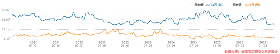 On the positioning side, the latest data show that non-commercial COMEX gold long positions (blue line) stood at 205,400 contracts, while short positions (yellow line) were 49,100 contracts. For COMEX silver, non-commercial long positions (blue line) stood at 32,800 contracts, while short positions (yellow line) were 9,393 contracts. In historical percentile terms, speculative net long positions in both gold and silver, defined as long positions minus short positions, have fallen sharply from their earlier historical highs.