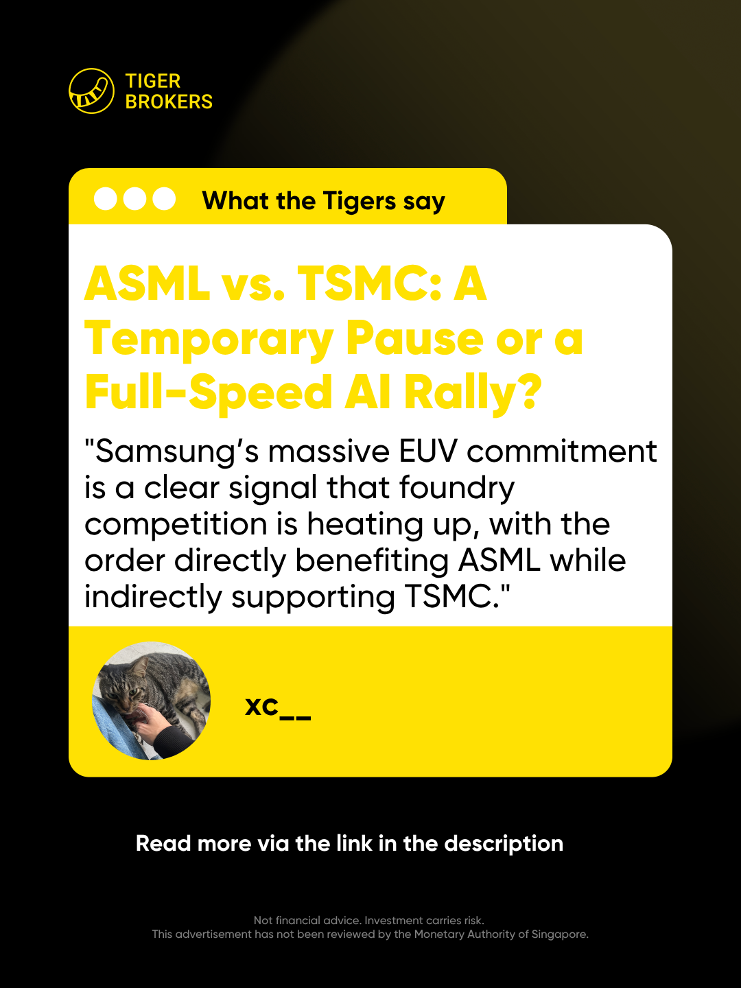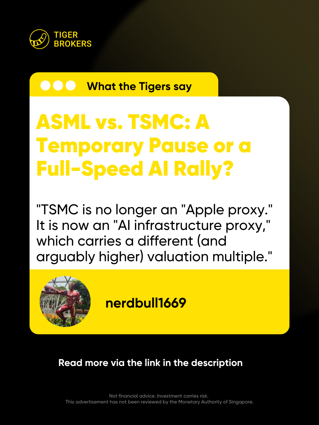 One framing: $Taiwan Semiconductor Manufacturing(TSM)$ could be viewed as a more direct AI-infrastructure exposure, while $ASML Holding NV(ASML)$ offers a higher-beta path to a similar thesis with additional policy-related variables. Some investors may think of TSMC as a basket anchor, ASML as convexity, and memory names (Hynix, $Micron Technology(MU)$ ) as potential late-cycle rotation if HBM demand continues pulling forward — though the appropriate mix depends on individual risk tolerance and time horizon.