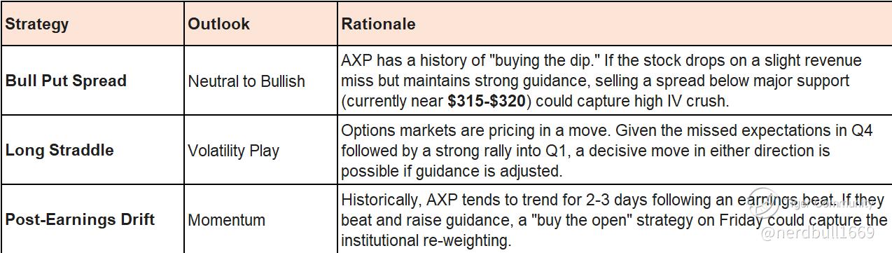 This might make AXP a good candidate for a bullish long call or Bull Put spread, but the timing to do it might be after the earnings.