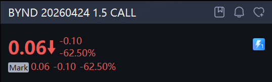 There are 644.46K Beyond Meat option contracts traded on Tuesday, up 45% from the previous trading day. Call options account for 88% of overall option trades. Particularly high volume was seen for the $1.5 strike call option expiring April 24, with 103,329 contracts trading. BYND 20260424 1.5 CALL