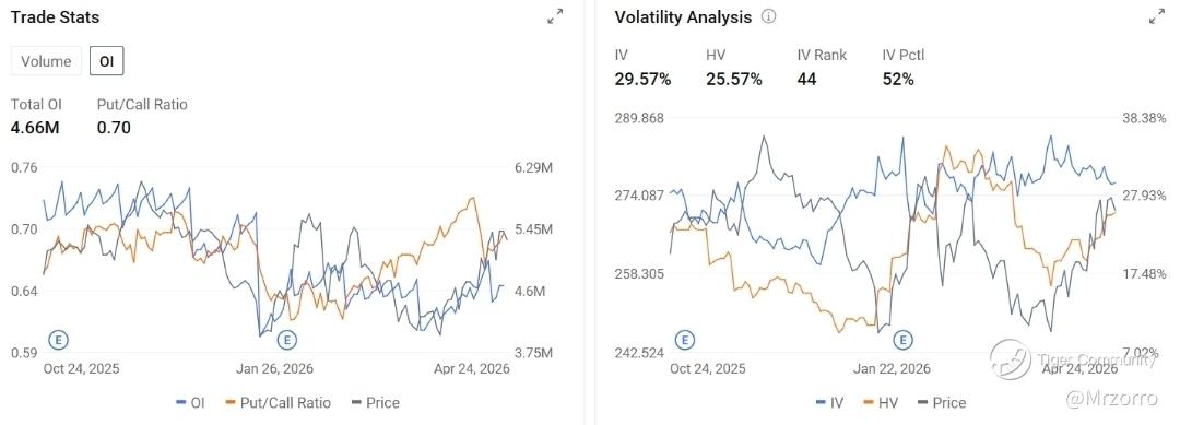 $Apple (AAPL.US)$ 's options market is painting a relatively calm picture with implied volatility at 29.57% only modestly above the 25.57% historical volatility and an IV Percentile of just 52%, while total open interest of 4.66M contracts and a put/call ratio of 0.70 suggest traders remain comfortably tilted toward calls, reflecting measured bullish conviction rather than any urgent hedging demand around the world's most valuable company.