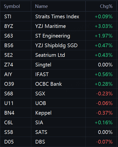 $(STI.SI)$ $(S63.SI)$ $(A17U.SI)$ $(N2IU.SI)$ $(8YZ.SI)$ $(SET.SI)$ $(A31.SI)$ $(BDX.SI)$ $(ES3.SI)$ $(G3B.SI)$ $(GAB.SI)$Disclaimer: Investing carries risk. This is not financial advice. The above content should not be regarded as an offer, recommendation, or solicitation on acquiring or disposing of any financial products, any associated discussions, comments, or posts by author or other users should not be considered as such either. It is solely for general information purpose only, which does not consider your own investment objectives, financial situations or needs. TTM assumes no responsibility or warranty for the accuracy and completeness of the information, investors should do their own research and may seek professional advice before investing.