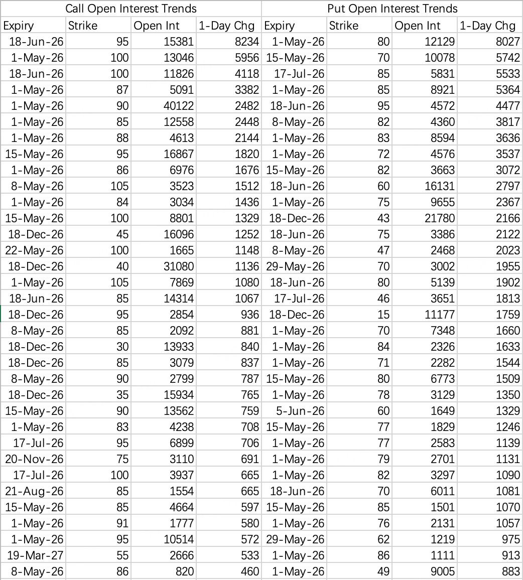 Put flow points to two possible paths: a pullback to fill the gap at 70, or consolidation at the 80 level. Both are plausible. Given the extremely expensive options premiums right now, selling puts is a reasonable start.