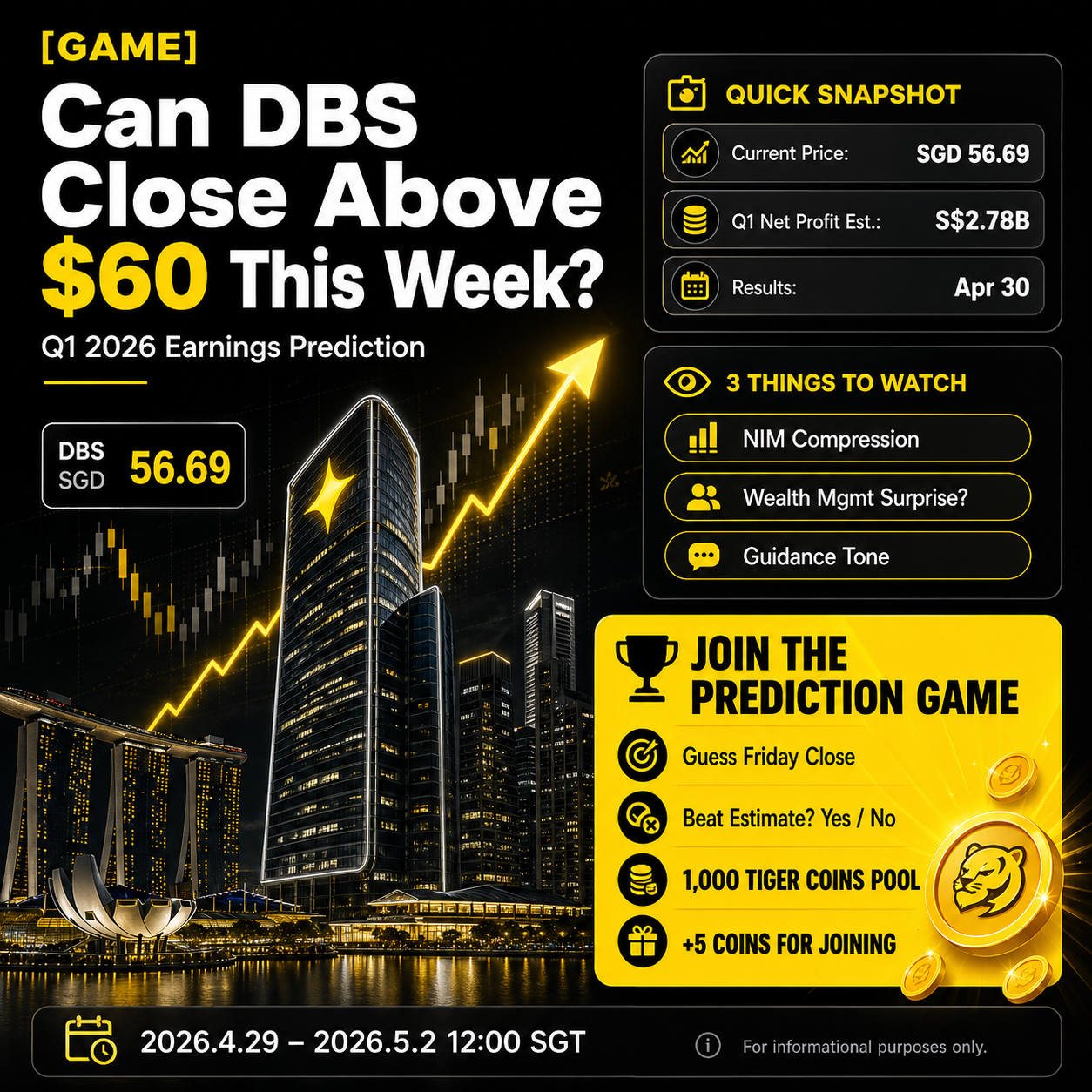 $DBS(D05.SI)$ reports Q1 2026 results this Thursday, April 30. The stock has pulled back from its record highs since the FY2025 earnings miss in February — when DBS posted net profit of S$11.033B, falling short of the Bloomberg consensus of S$11.375B and down 3% YoY. 4Q FY2025 net profit of S$2.358B also came in 10% below the prior year.