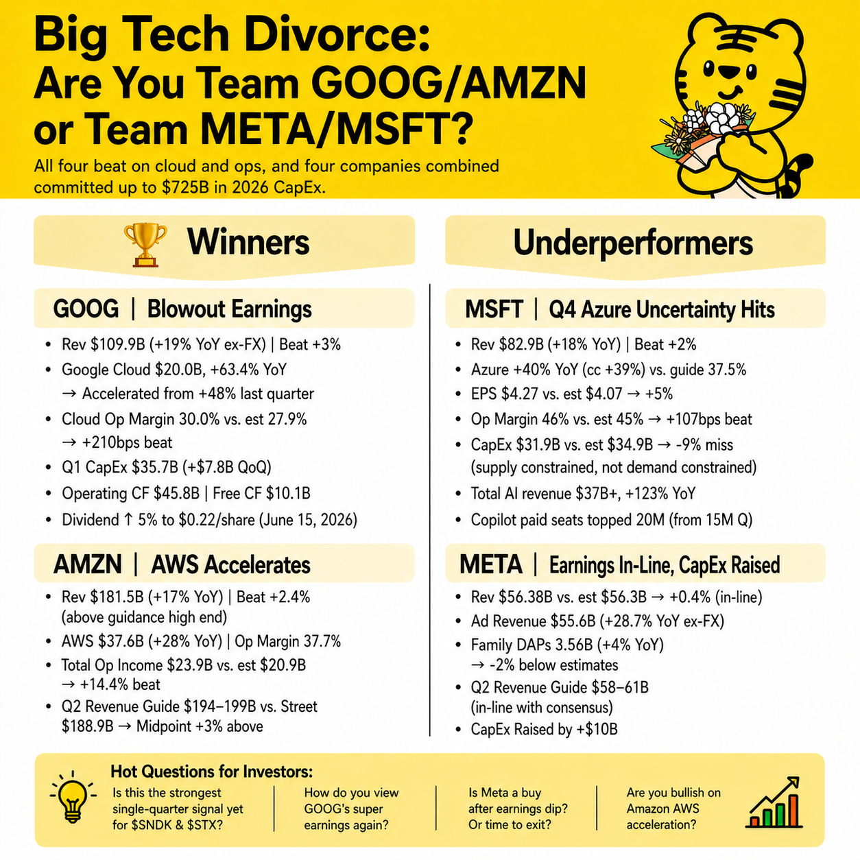 $Alphabet(GOOG)$ and $Amazon.com(AMZN)$ rallied after-hours. $Microsoft(MSFT)$ dropped -2%, $Meta Platforms, Inc.(META)$ loses 9%. Four companies combined committed up to $725B in 2026 CapEx — more aggressive than the market expected.