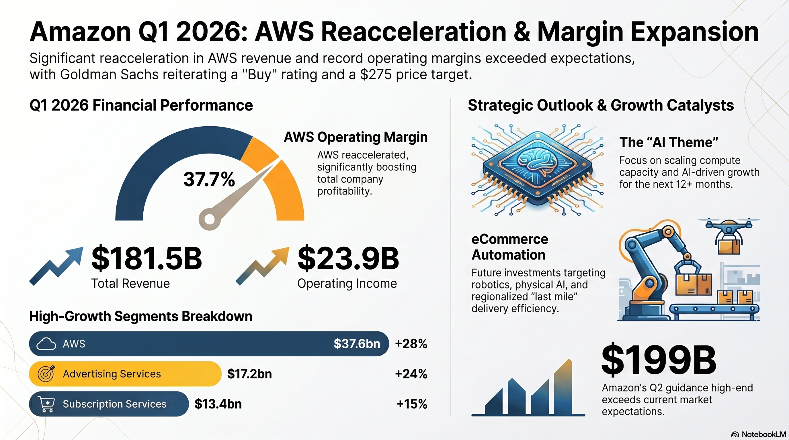 - AWS: $37.6B (+28% YoY), AWS Op Margin 37.7%